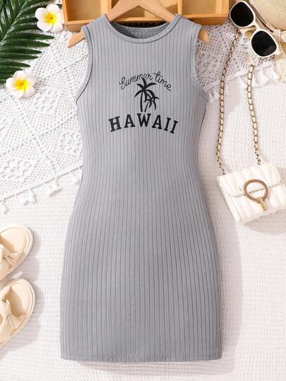 SHEIN 女童度假棕榈树印花针织背心裙,轻盈 - 灰色 - 查看 1