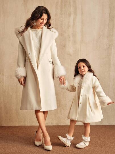 SHEIN 女童白色长款外套,珍珠纽扣 V 领,优雅秋冬外套,家庭装搭配 - 白色 - 查看 11