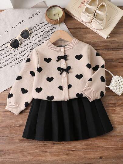 SHEIN 少女心形图案前扣长袖上衣和黑色裙子毛衣套装 - 彩色 - 查看 1