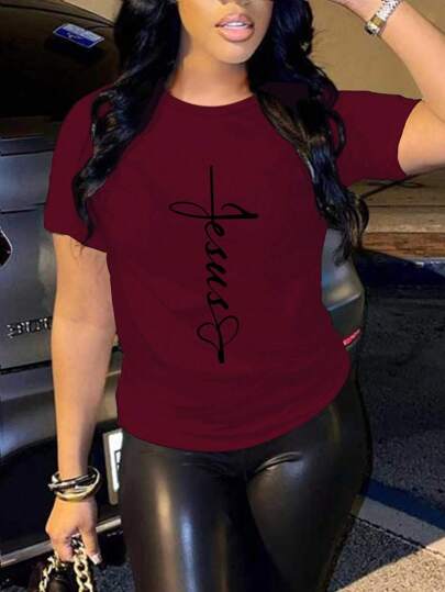 SHEIN 心形字母印花短袖 T 恤图案 T 恤女式上衣 - 酒紅色 - 查看 1