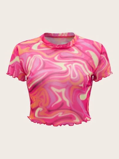 SHEIN ICON 90年代大理石圖案木耳邊短款網紗上衣 - 彩色 - 查看 1