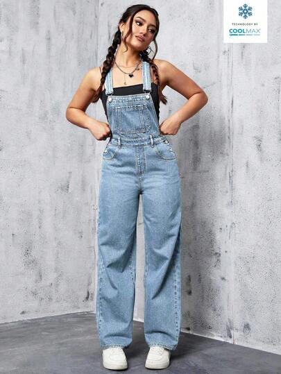 SHEIN ICON Coolmax女款時尚簡約寬鬆寬腿牛仔背帶褲 - 淺色水洗藍 - 查看 1