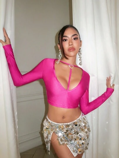 SHEIN ICON 深v領長袖緊身t恤,具有心型鑽石套鈕裝飾