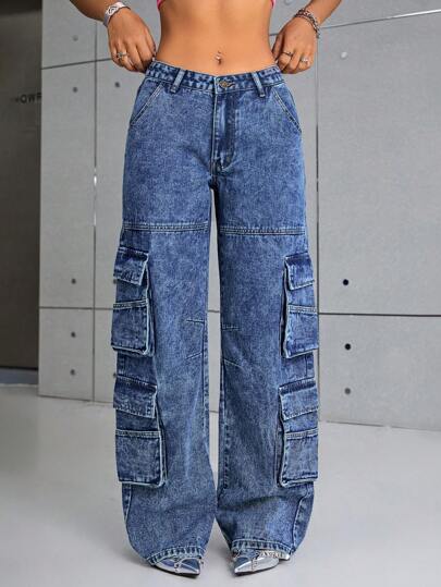 SHEIN ICON 鈕扣 口袋 拉鍊純色女士牛仔褲 - 中等水洗藍 - 查看 1