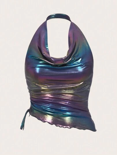 SHEIN ICON 全息垂墜正面抽繩側掛脖上衣 - 紫色 - 查看 1