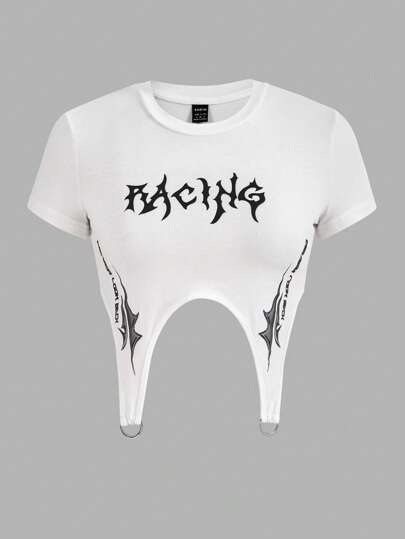 SHEIN ICON 字母圖案不對稱下擺短款T恤
