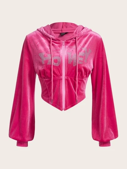 SHEIN ICON 秋冬字母水钻拉链天鹅绒连帽衫 - 玫紅色 - 查看 1