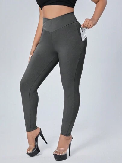 SHEIN ICON 加大碼高腰口袋運動褲,側邊條紋設計 - 深灰色 - 查看 1