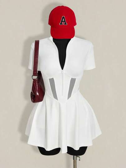 SHEIN ICON 大码露腰透视收腰A字针织连衣裙,修身运动A字网球裙 - 白色 - 查看 1