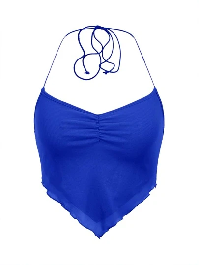 SHEIN ICON 褶邊後背繫帶手帕下擺網紗掛脖上衣 - 寶藍色 - 查看 1
