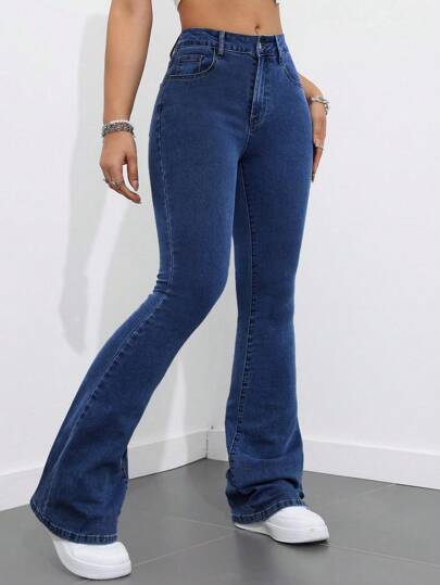 SHEIN ICON 紧身喇叭牛仔裤,休闲时尚,适合日常穿着 - 深色水洗藍 - 查看 1