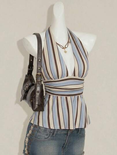 SHEIN ICON 女士休闲深V领露背吊带背心,女士休闲背心,美式复古条纹,女士夏季服装