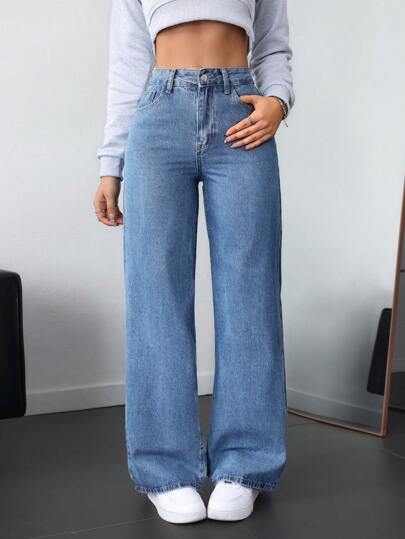 SHEIN ICON 女士休闲百搭日常洗水宽松阔腿牛仔裤 - 中等水洗藍 - 查看 1