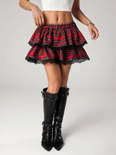 SHEIN ICON 女士万圣节格子双层荷叶边蕾丝迷你裙 - 彩色 - 查看 1