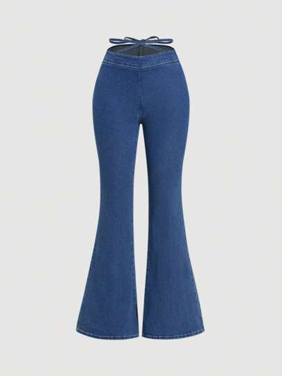 SHEIN ICON 女士腰部交叉打結喇叭牛仔褲