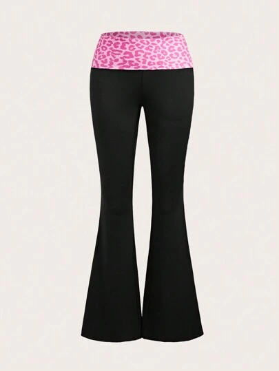 SHEIN ICON 粉色豹紋拼接摺疊腰喇叭褲,超低腰款式 - 黑色 - 查看 1