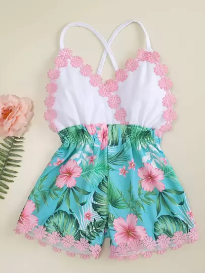 SHEIN 年輕女孩熱帶印花,刺繡交叉背帶連體衣 - 彩色 - 查看 1