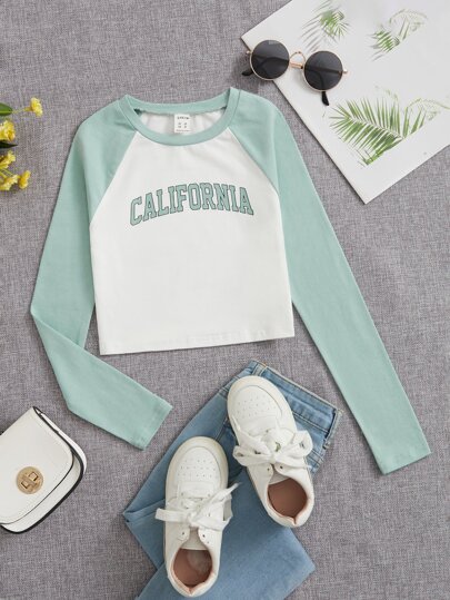 SHEIN 圓領長運動袖少女字母印花T卹 - 薄荷綠 - 查看 1