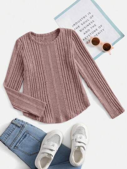 SHEIN 女大童素色弧形下擺條紋針織T恤 - 藕粉色 - 查看 1