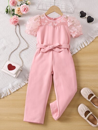 SHEIN 年輕女孩粉色純色甜美風格城市街道連身褲,小圓領和公主袖子,夏季必備 - 粉色 - 查看 1