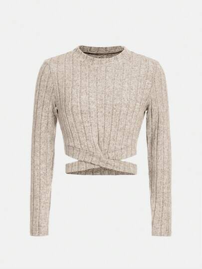 SHEIN 女大童十字交叉腰部鏤空短款T恤 - 杏色 - 查看 1