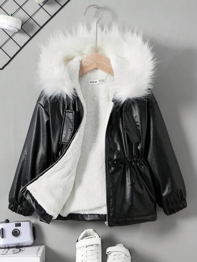 SHEIN 女小童腰部抽繩毛茸邊連帽加絨內裏外套 - 黑色 - 查看 1