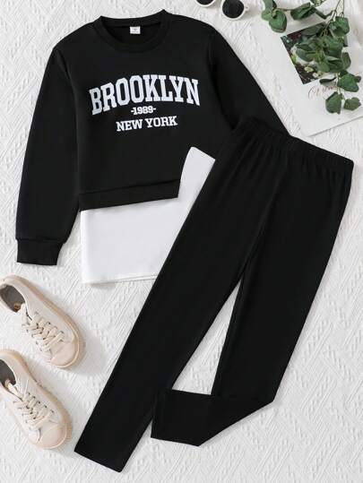 SHEIN Tween 女孩休閒街頭字母拼布 2 合 1 運動衫和騎行褲套裝 - 彩色 - 查看 1