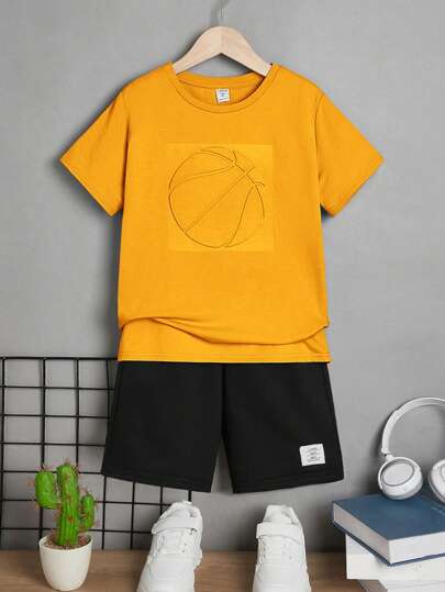 SHEIN 籃球压花短袖t恤和短褲套裝,舒適休閒風格,適用於男孩 - 黃色 - 查看 1