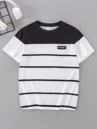 SHEIN 少年男童寬鬆運動款圓領條紋拼接短袖t恤 - 黑與白 - 查看 1