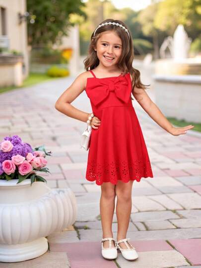 SHEIN 小女童前蝴蝶結鏤空吊帶連衣裙 - 紅色 - 查看 1