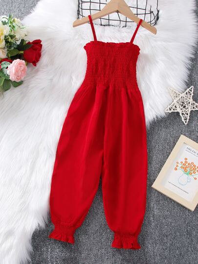 SHEIN 年輕女孩波紋邊細肩肩帶連體褲 - 紅色 - 查看 1