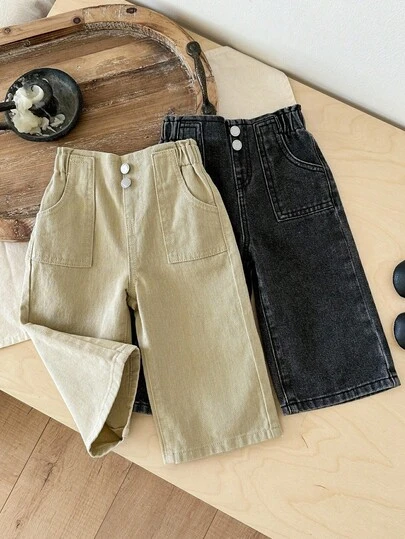 SHEIN LMoss Kids 2件套女婴卡其色和黑色宽松牛仔裤 - 彩色 - 查看 1