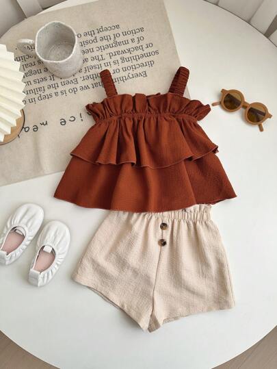 SHEIN LMoss Kids 女婴可爱夏季度假荷叶边吊带上衣和短裤套装 - 棕色 - 查看 1