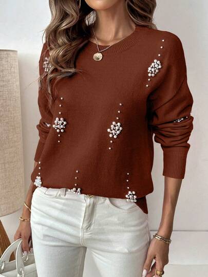 SHEIN LUNE 休闲柔软珍珠装饰女式毛衣 - 鏽棕色 - 查看 1
