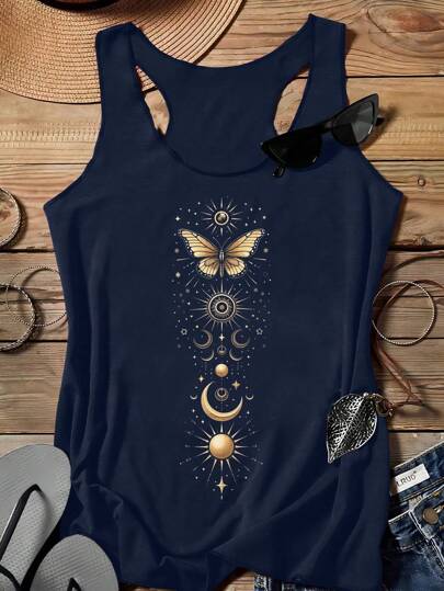 SHEIN LUNE 休闲太阳、月亮、星星、蝴蝶印花女式背心,适合夏季返校季穿着,休闲百搭。 - 藏蓝色 - 查看 1