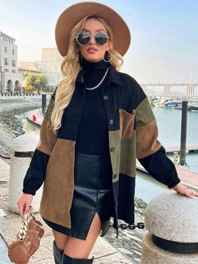 SHEIN LUNE 拼色落肩袖燈芯絨大衣 - 彩色 - 查看 6