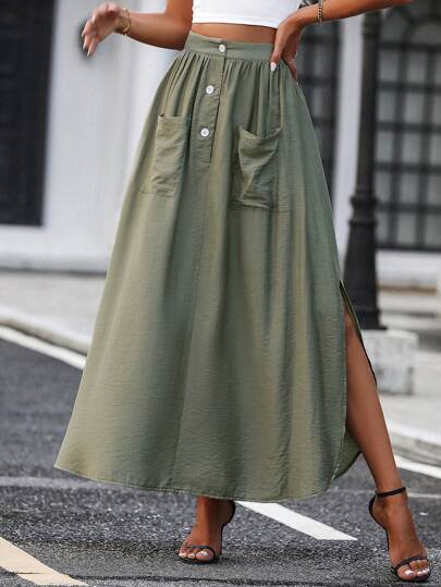 SHEIN LUNE 雙口袋高衩前紐扣半身裙 - 綠色 - 查看 1