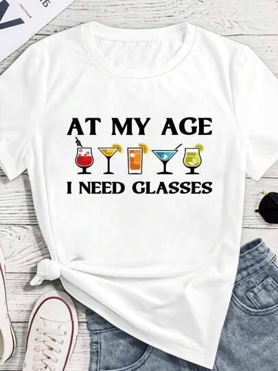SHEIN LUNE 时尚简约酒杯印花休闲短袖 T 恤图案 T 恤女式上衣