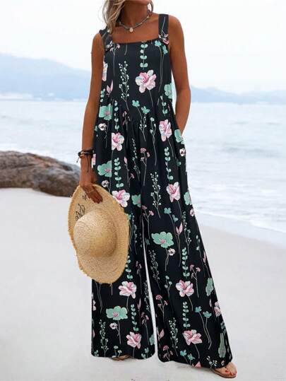 SHEIN LUNE 花卉印花寬腳連身褲,適合渡假和休閒