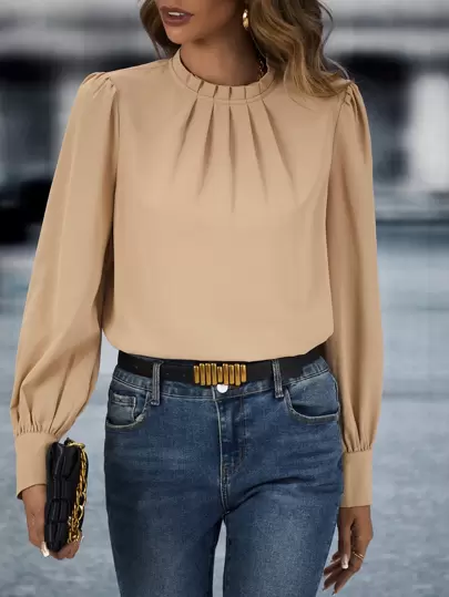 SHEIN LUNE 褶邊領泡泡袖襯衫 - 卡其色 - 查看 1