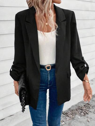 SHEIN LUNE 西裝領捲邊袖西裝外套 - 黑色 - 查看 1