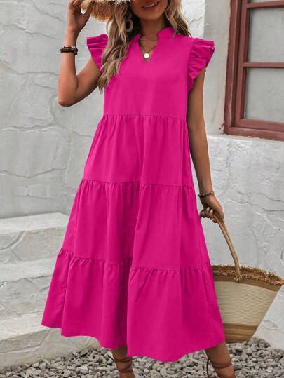 SHEIN LUNE 缺口领口荷叶边饰罩衫连衣裙长款女装 - 玫紅色 - 查看 1