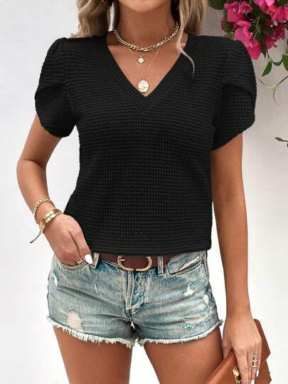 SHEIN LUNE 花瓣袖華夫格編織T恤 - 黑色 - 查看 1