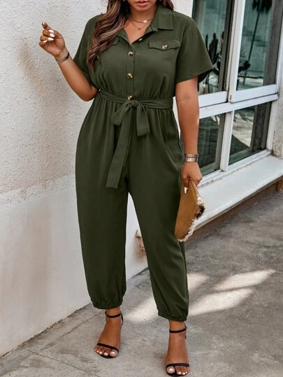 SHEIN LUNE 加大翻盖细节系腰带衬衫连体裤 - 軍綠色 - 查看 1