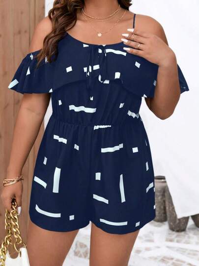 SHEIN LUNE 大碼幾何印花挖肩荷葉邊連身短褲 - 藏蓝色 - 查看 1