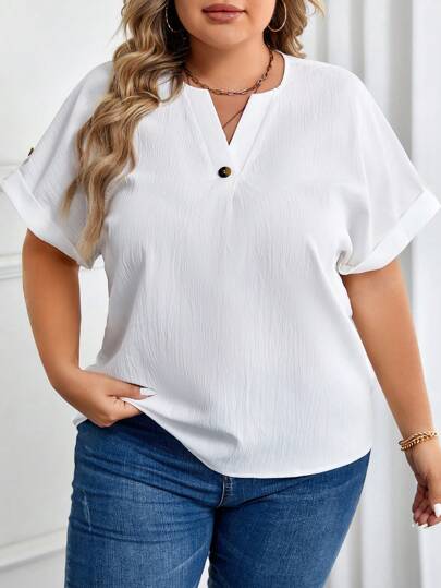 SHEIN LUNE 大碼缺口領蝙蝠袖襯衫 - 白色 - 查看 1