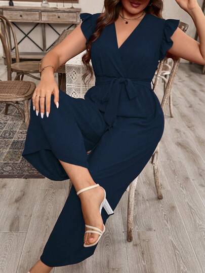 SHEIN LUNE 加大號荷葉邊袖裝飾配腰帶闊腿連身褲 - 藏蓝色 - 查看 1