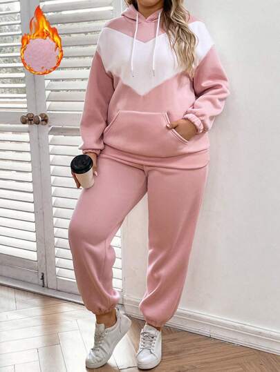 SHEIN LUNE 大尺碼袋鼠口袋兩色抽繩連帽衫和褲子兩件套 - 粉色 - 查看 1