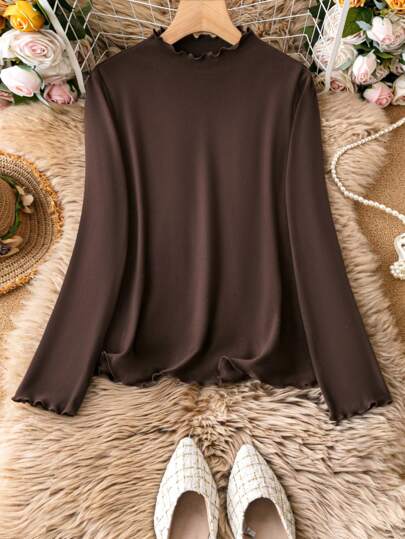 SHEIN LUNE 大尺碼純色立領t卹 - 棕色 - 查看 1