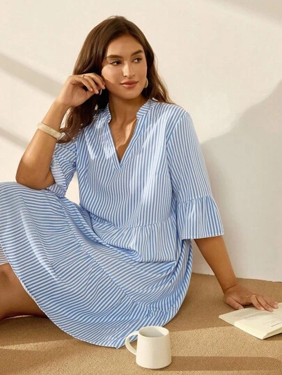 Nubod 女性加大碼條紋簡約百褶設計洋裝 - 藍色 - 查看 1